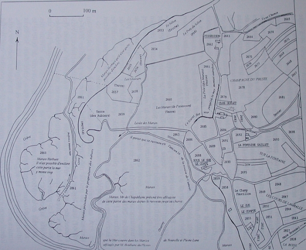 Dans : "L'industrie ancienne du sel dans le Penthièvre littoral" / Jacques-Henri Clément, Rennes : UHB, Rennes 1, Thèse d'Etat de Docteur en Pharmacie, 1989, P. 68.Plan cadastral.