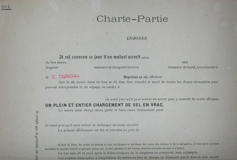 Charte-partie de E. Dundas, négociant en sel, affréteur, 1er quart 20e siècle (collection Grimaud)Immatriculation