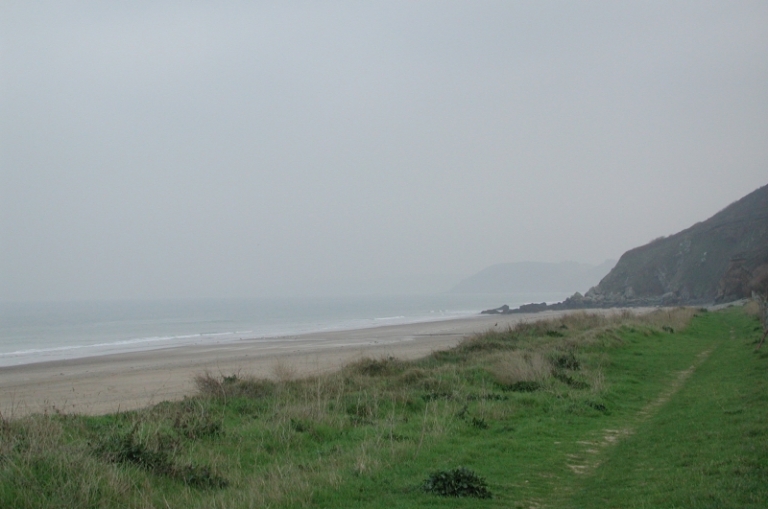 Vue vers la plage de Nantois avec le sentier côtier enbord de la plage et du golfImmatriculation