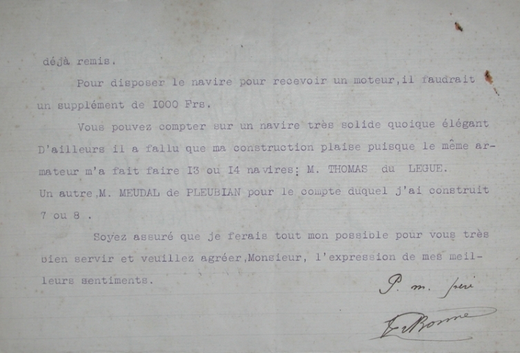 Devis manuscrit du chantier Bonne-Lesueur pour la goélette Julie de Ernest Durand, 1913 (verso)Immatriculation
