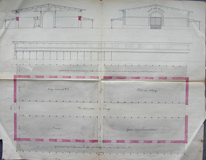 Second projet (non réalisé). Variante des élévations et plan au sol. Joseph Bigot, architecte. Vers 1848 (A.D. Finistère, 122 J 11)Immatriculation