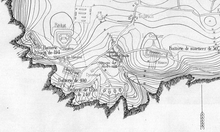 Détail du plan de l'ensemble fortifié de Toulbroc'h, Atlas des batteries de côte : place de Brest, vers 1900 (collection : Service Historique de la Défense, Château de Vincennes)Immatriculation