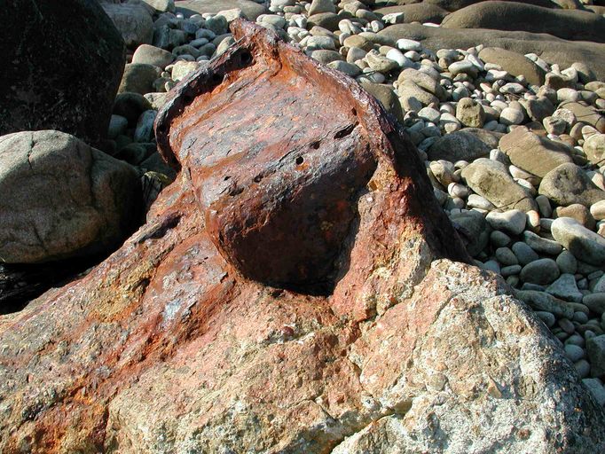 Vue d'un canon Skoda de 47 mm projeté sur la grève de Penn Enez. Le béton est coulé autour du blindage du canonImmatriculation