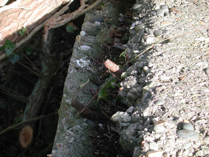 Vue d'un mur latéral réalisé en maçonnerie et béton armé : tiges filetées permettant la fixation de la charpente métallique (état en 2003)Immatriculation