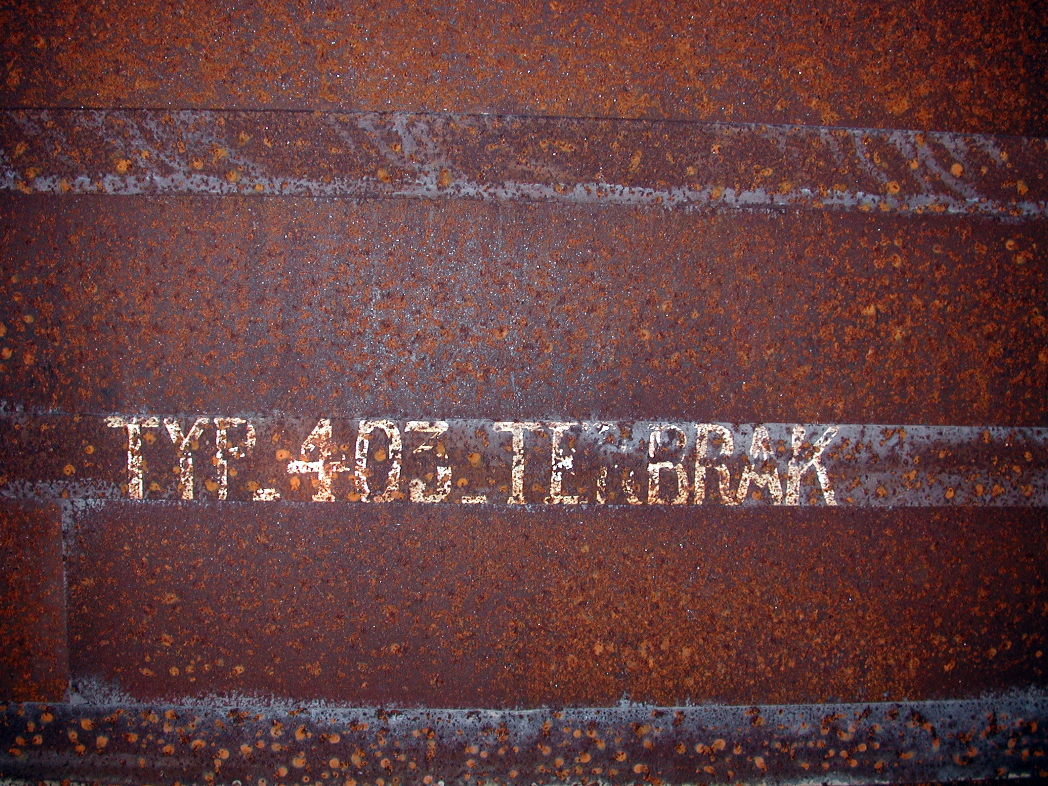 Vue du marquage peint sur l'une des poutrelles métalliques en I du plafond : "TYP. 403.TERBRAK" (état en 2003). Il fait référence à son plan-type standard (L403) et à l'entreprise allemande TERBRAK qui a partcipé à l'édification du Mur de l'AtlantiqueImmatriculation