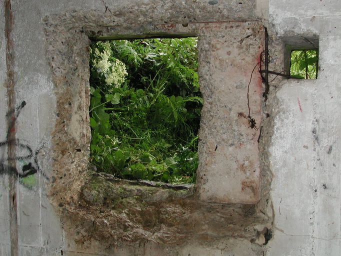 Vue de l'embrasure depuis l'intérieur de l'ouvrage. Le volet blindé a été ferrailléImmatriculation