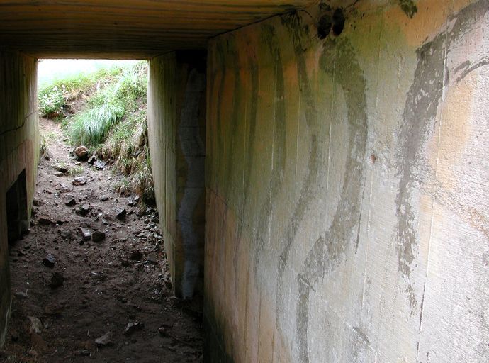 Guissény : vue de l'entrée de l'abri de Beg ar Skeiz avec sa peinture de camouflage couleur ocreImmatriculation
