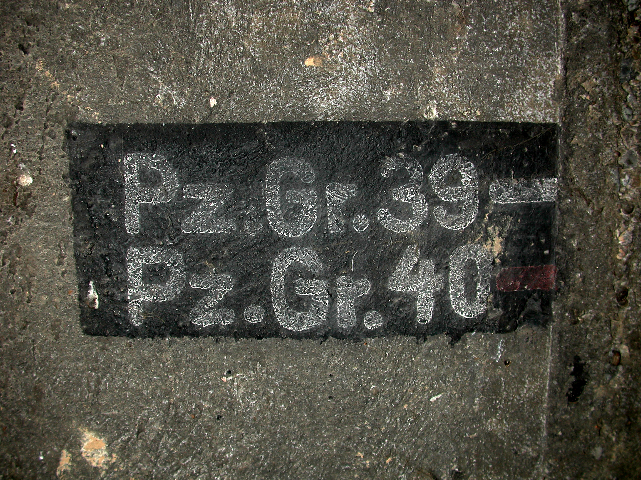 Vue de diverses inscriptions situées dans l'un des magasins de munitions : Pz.Gr.39 / Pz.Gr.40. Pz.Gr. est l'abréviation de Panzergranate en allemand, obus perforant anti-charImmatriculation