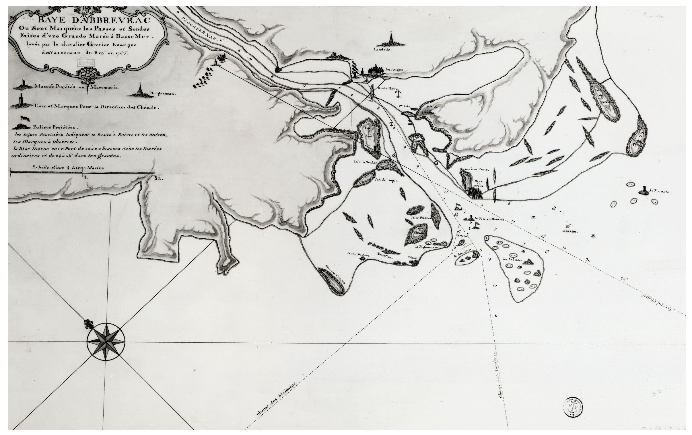 Carte marine de l'Aber Wrac'h faite à grande marée de basse mer par le chevalier Grenier Enseigne des vaisseaux du Roi en 1766, Bibliothèque nationale, portefeuille 46, division 3, pièce n° 9 (Yann Le Nestour - association Cézon, document n° 48)Immatriculation