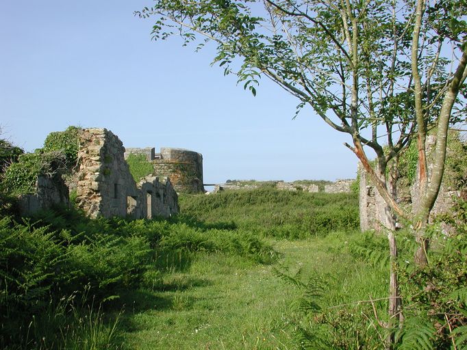 Landéda, fort Cézon : Vue du fort depuis l'entrée : à droite du pont-levis de la tour d'artillerie, les vestiges de la caserne haute ; au premier plan à gauche la caserne du 18e siècle et à droite celle du 19e siècleImmatriculation
