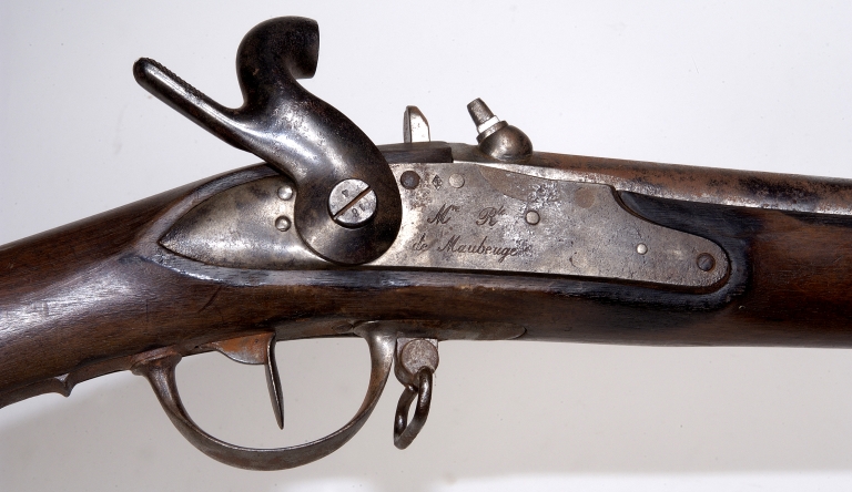 Fusil fabriqué à Maubeuge : détail de la platineImmatriculation