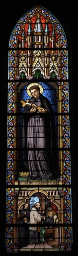 Ensemble des 9 verrières à personnages des baies 0 à 8 : Sacré Coeur, Saint Méen, Saint Laurent, Saint Lunaire, Saint Isidore, Saint François d'Assise, Saint Louis de Gonzague, Vie de la Vierge, et des 7 verrières décoratives de la nef,