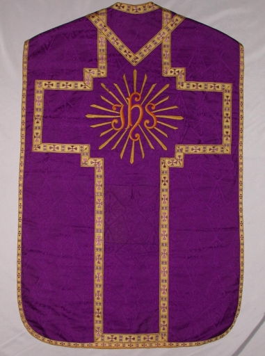 Ornement violet 1 : chasuble, bourse de corporal, étole, manipule, voile de calice,