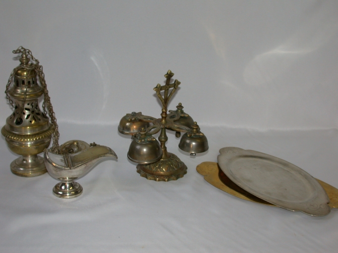 Encensoir et navette à encens ; sonnette liturgique ; plateaux de communionImmatriculation