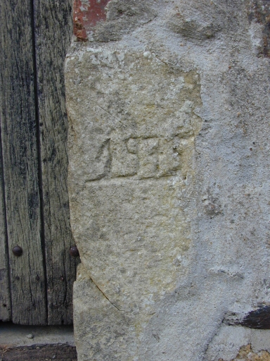 Façade antérieure, date gravée sur le jambage de la porte : détailImmatriculation