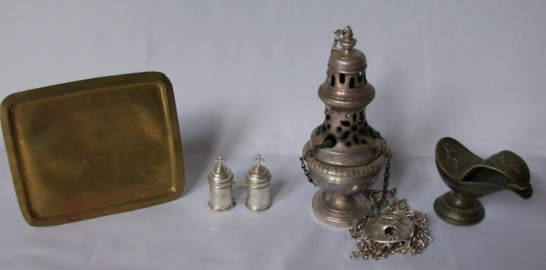 Plateau de communion, paire d'ampoules, encensoir, navette à encensImmatriculation