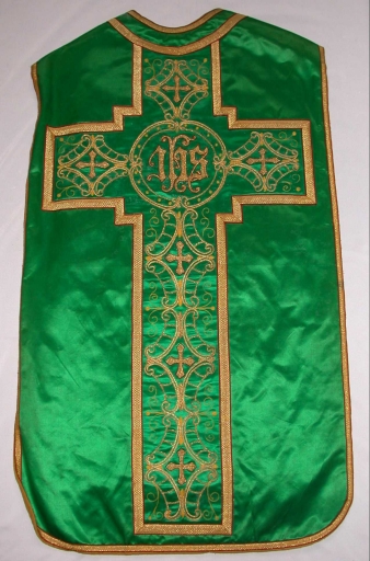 Ornement vert : chasuble, bourse de corporal, étole, manipule, voile de calice,