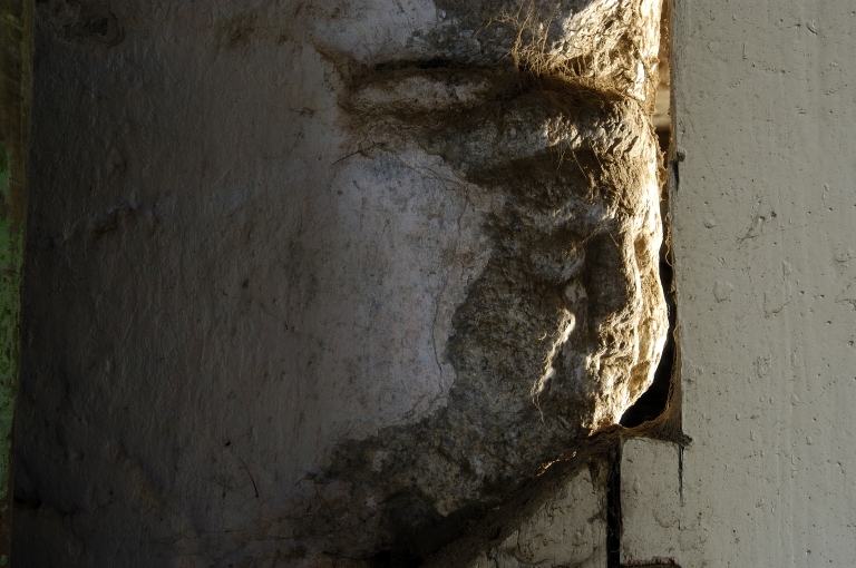 Etable, escalier en vis, détail de la tête sculptée sur le noyauImmatriculation