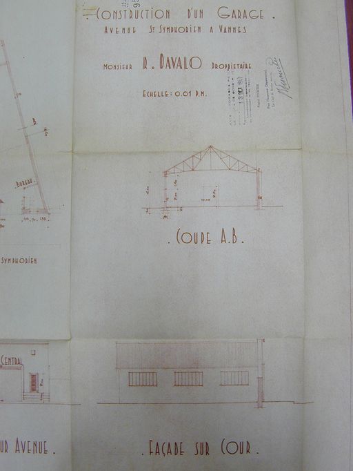 Coupe du garage et élévation de la façade sur cour par Perrin, 1947. AM Vannes 1G59.Immatriculation