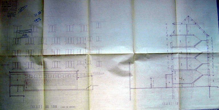 Corps rajouté sur la rue Pobéguin, élévation de la façade sur cour par Guillou, 1953. AM Vannes 1G59.Immatriculation