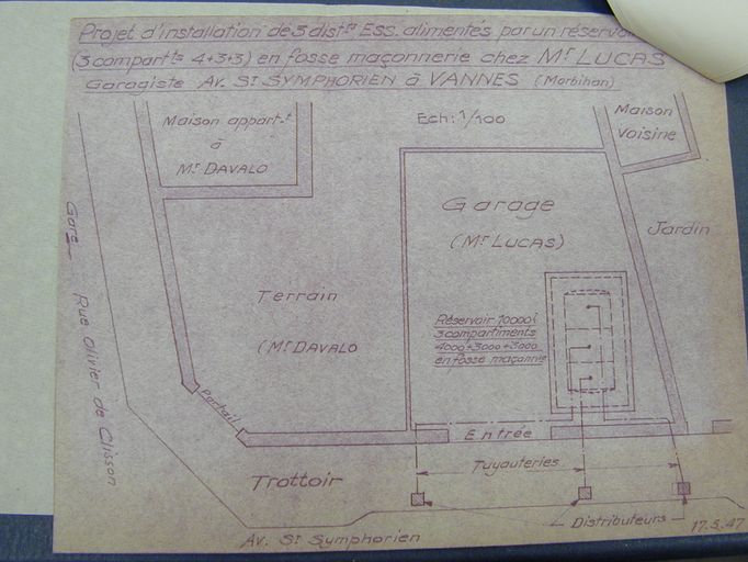 Plan dressé pour l'installation de pompes à essence, 1947. AM Vannes 1G59.Immatriculation