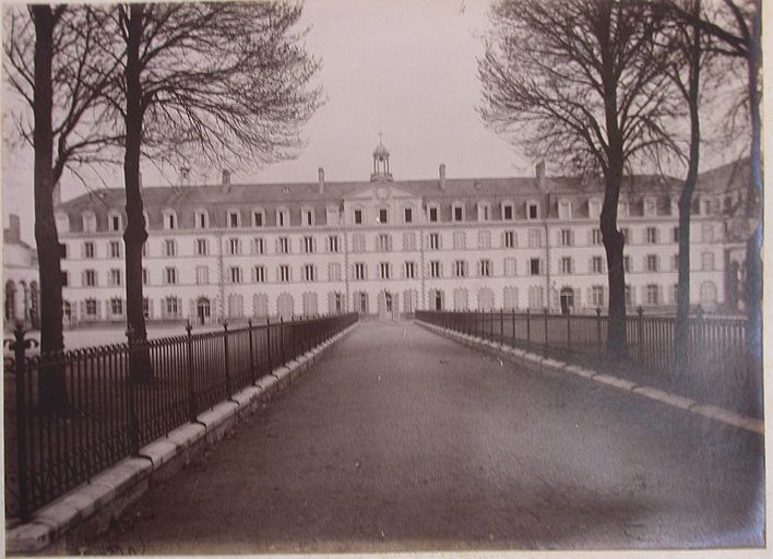Vue du bâtiment des études donnant sur les cours de récréations vers 1900 dans album d'anniversaire. Fonds Saint-François-Xavier. AM Vannes.Immatriculation