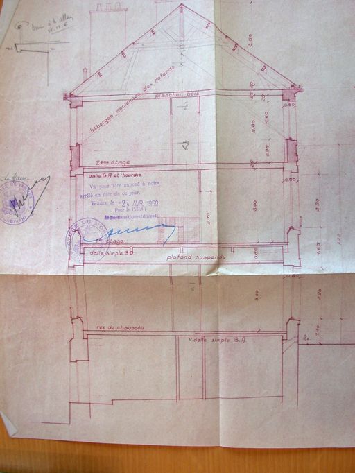 Transformation de l'ancienne infirmerie en HLM. Projet de Yves Guillou, 1949. Coupe. AD Morbihan 110 J 4013.Immatriculation