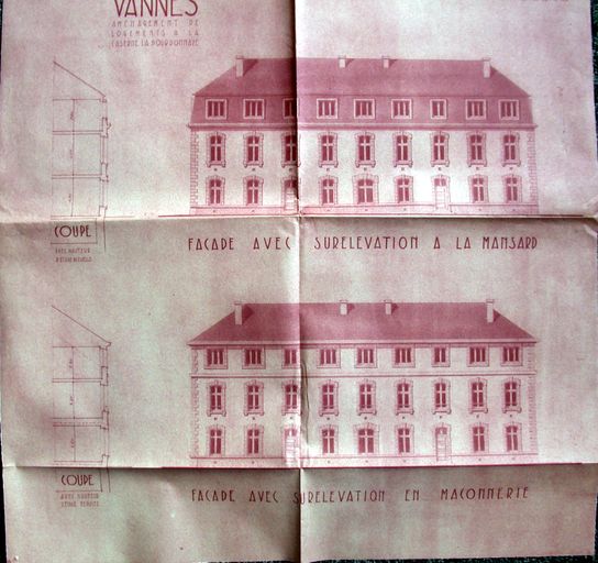 Transformation de l'ancienne infirmerie en HLM. Projet de Yves Guillou, 1949. Elévations projetées. AD Morbihan 110 J 4013.Immatriculation