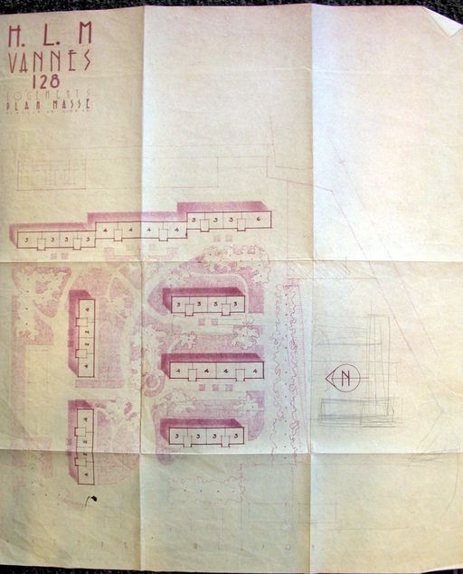 Réalisation de 128 logements HLM. Projet de Yves Guillou, 1954. Plan de masse. AD Morbihan 110 J 4033.Immatriculation