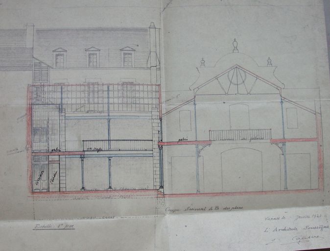 Projet d'agrandissement par Joseph Caubert de Cléry, janvier 1920 : coupe. AM Vannes 5 I 162.Immatriculation