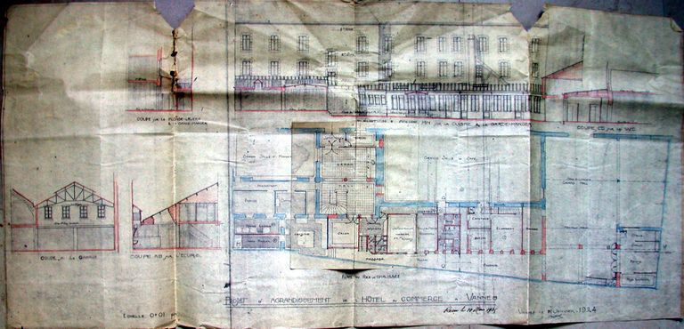 Projet d'agrandissement de l'hôtel. Dessin par Joseph Caubert de Cléry pour Mme Delory, janvier 1924. AM Vannes.Immatriculation