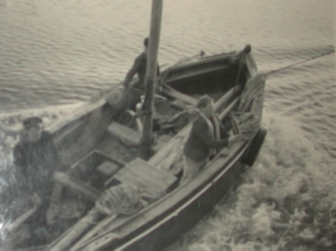 Les deux frères Le Pierres à bord de la Marcel-Micheline, avec le chalut à percheImmatriculation
