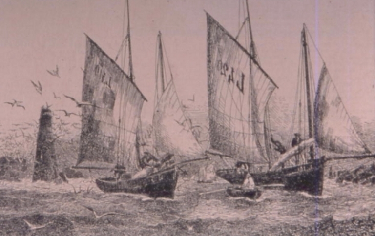 Sablier de la rivière de Lannion sous leur gréement de flambart, dessiné par Faudacq en 1891 pour la revue Le YachtImmatriculation
