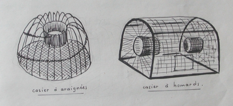 Dessins : casiers à araignées en bois et casier à homards en fer (Yves Audern)Immatriculation