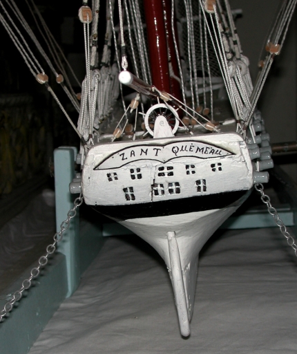 Vue de détail de l'arrière de la maquette ex-voto du type trois-mâts carrés Zant-QuemeauImmatriculation