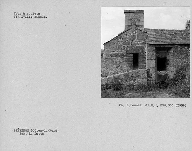 Vue du four à boulets du fort La Latte : façade Nord-est, glacis et goulote de réception des boulets rouges, foyer, 1959Immatriculation