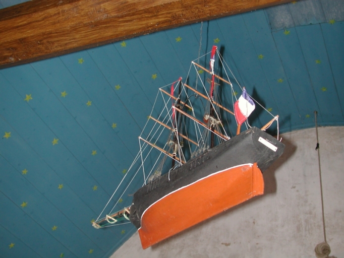 Vue en contre-plongée d'une maquette ex-voto trois-mâts (chapelle Sainte-Barbe)Immatriculation