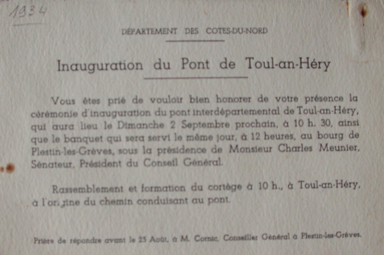 Carton d'invitation pour I'inauguration du pont le 2 septembre 1934Immatriculation
