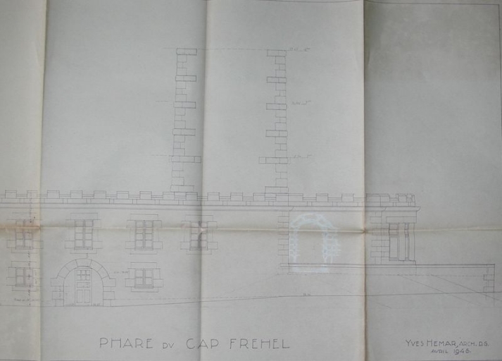 Dessin calque : façade est du nouveau phare de Fréhel, avril 1946, par Yves Hémar, architecte (DDE 22)Immatriculation