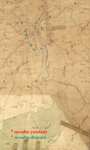 Localisation des moulins de la commune, sur fond du tableau d'assemblage de 1825Immatriculation