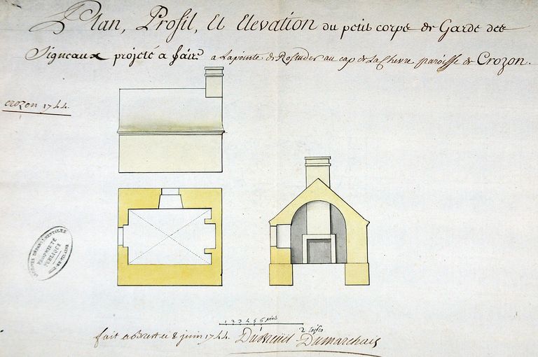 Elévation, plan et profil d'un petit corps de garde des signaux projeté à faire à la pointe de Rostuder au cap de la Chèvre dans la paroisse de Crozon, fait à Brest le 8 juin 1744 par Dubreuil DumarchaisImmatriculation