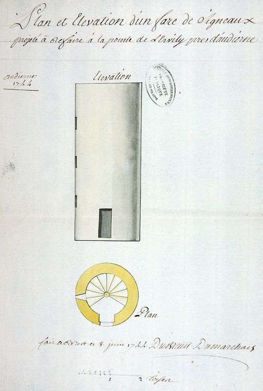 Elévation et plan d'un phare de signaux projeté de faire à la pointe de l'Ervily près d'Audiern (Finistère Sud), fait à Brest le 8 juin 1744 par Dubreuil DumarchaisImmatriculation