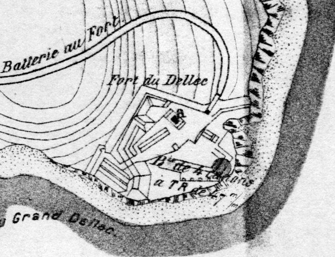 Extrait du plan de situation des batteries de Dellec (batterie du fort : 4 canons à tir rapide de 47 mm), Atlas des batteries de côte : côte de Brest, 1893, VincennesImmatriculation