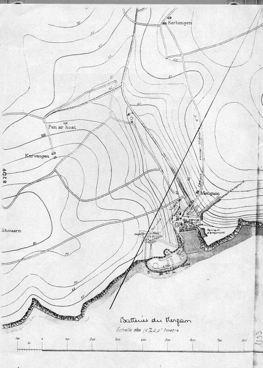 Plan de situation des batteries du Mengant (batterie du fort : canons à tir rapide de 47 mm, batterie basse du ravin : 4 canons de 32 cm), Atlas des batteries de côte : côte de Brest, 1893, VincennesImmatriculation