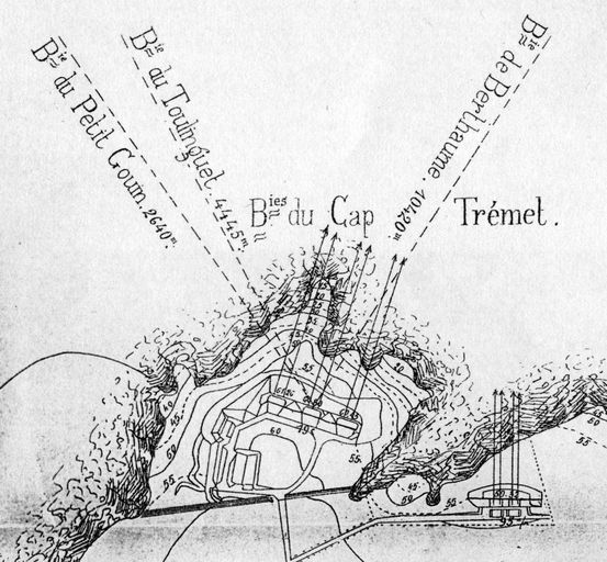 Détail du plan de situation des lignes et du réduit de Quélern : batterie du Cap Trémet), Atlas des batteries de côte : côte de Brest, 1893, VincennesImmatriculation