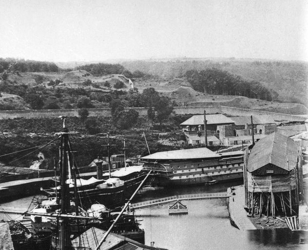 A l'arrière-plan : plate-formes d'artillerie de l'ouvrage à cornes de Quéliverzan en 1863Immatriculation