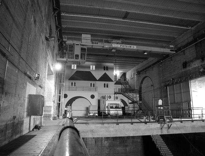 Vue intérieure de la base de sous-marins (2004) : dernière alvéole vers l'est (préfabriqué servant de bureau et portique de manutention)Immatriculation