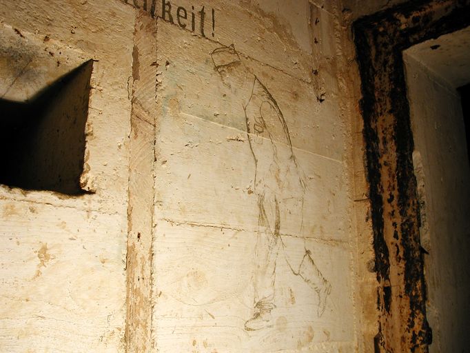 Vue générale depuis l'entrée : peinture murale et maxime, représentation d’un soldat allemand, tête baissée et mains dans les poches, "traînant la patte"…, une savate au pied, l'autre pied portant une botte...Immatriculation