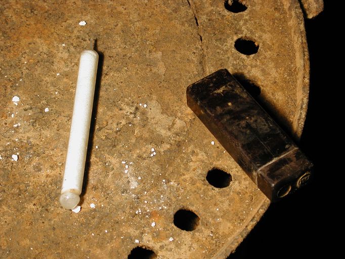 Petits objets - ampoule et étui - trouvés dans le bunker par le concierge du collègeImmatriculation