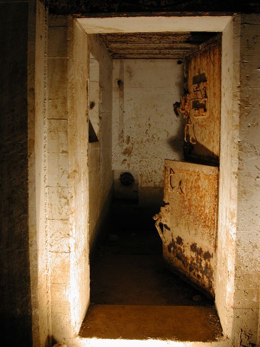 Vue de l'entrée n° 2 (aujourd'hui murée) : porte blindée à deux vantaux de type 434 P 01 avec guichet observateur fermant le sas étancheImmatriculation